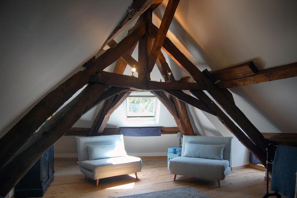 The entrance to this room is via a staircase on the side of the mill, or inside via a staircase in the kitchen. You enter into a nice, spacious bedroom with a comfortable double bed. There are also 2 sofa beds here, which we easily convert into excellent children’s beds with extra mattresses. Perfect for a family with (maximum 2) children up to 12 years!